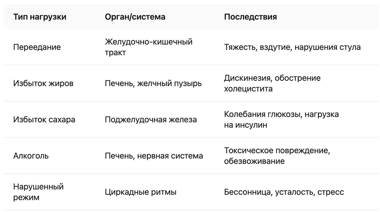 Новогодние праздники традиционно сопровождаются обильным застольем, которое растягивается на несколько дней. Калорийность праздничного стола может превышать обычную дневную норму в два-три раза, а то и больше. Тяжёлые салаты с майонезом, жареные блюда, копчёности, десерты с кремом — всё это создаёт колоссальную нагрузку на желудочно-кишечный тракт и печень.